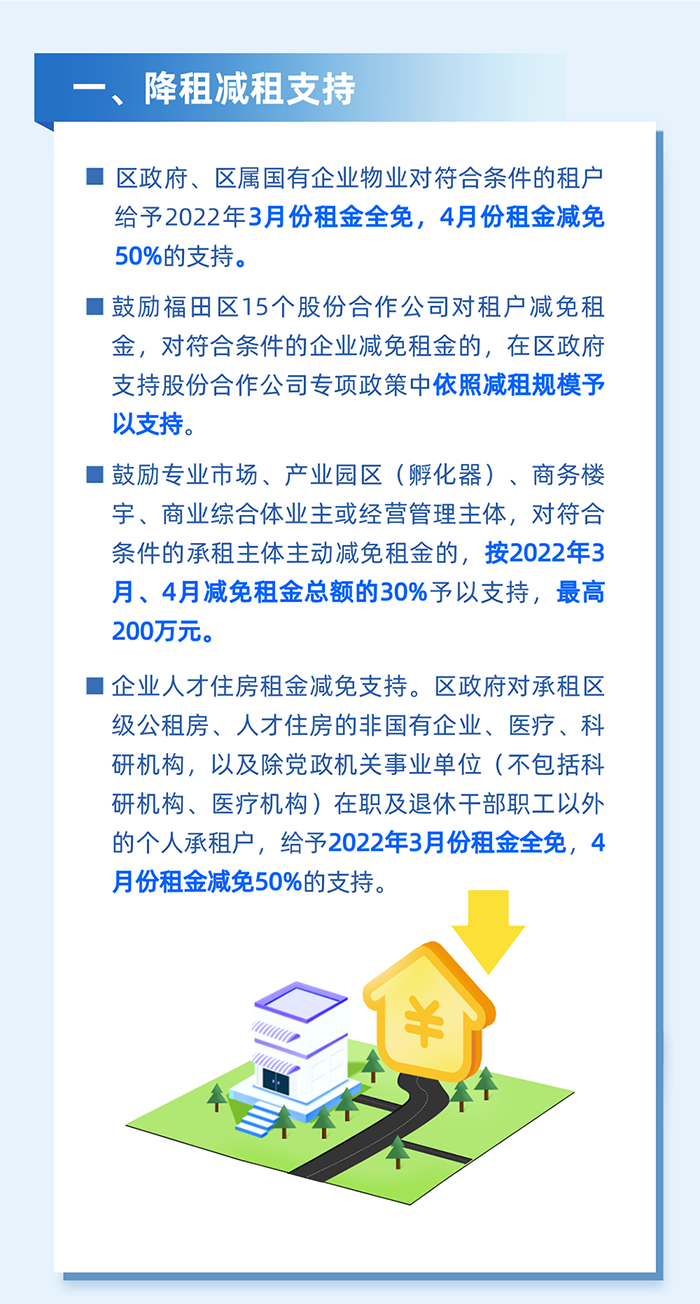 鼓勵倡導其他市場主體參照減免物業租金。對2022年3月1日至5月31日期間實際減免租金60萬元以上的社區股份合作公司(按歸屬社區股份合作公司的租金計算),及經營管理工業園區、寫字樓、商場等物業的企業,按其減免實際租戶租金的20%予以支持,單家企業最高200萬元。(牽頭單位:區投資推廣和企業服務中心)