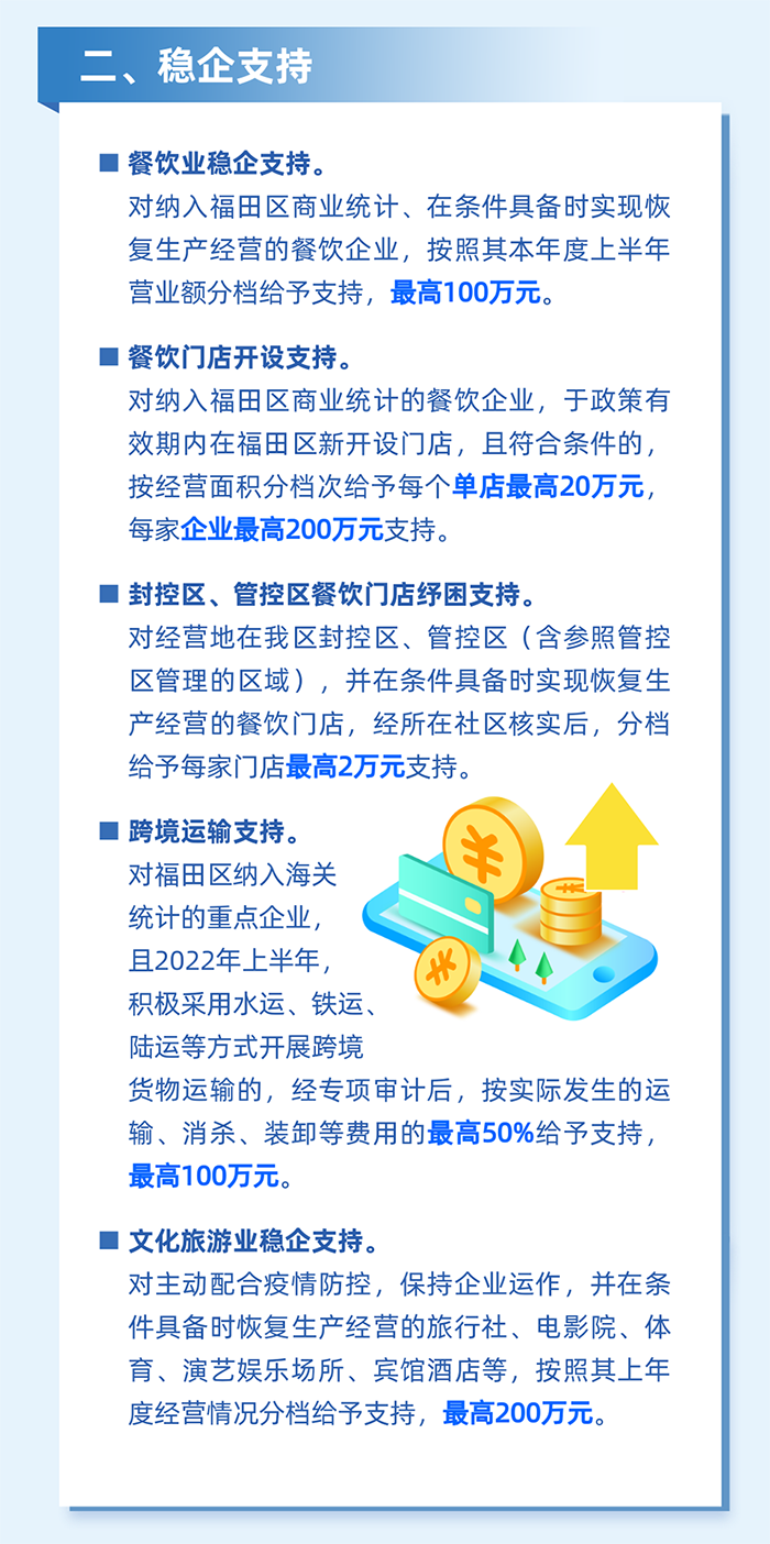 6.對南山區限上零售、住宿、餐飲業企業,按2021年實現銷售額(營業額)分檔予以穩企補貼,每家企業最高不超過50萬元。(責任單位:區工業和信息化局)
