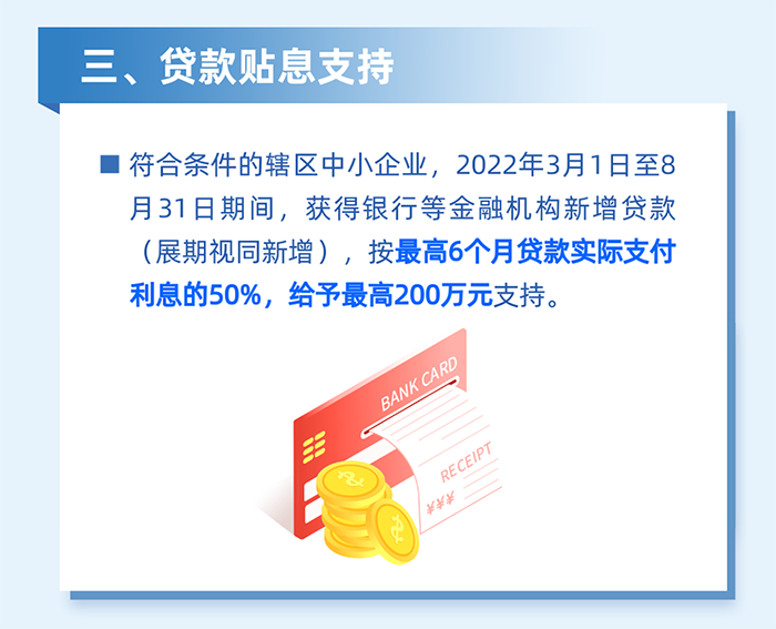 8.金融助力中小微企業發展,降低企業融資成本,對南山區中小微企業在2022年2月16日至4月30日期間(以發放貸款時間為準),獲得銀行等金融機構貸款(含展期)的,按實際支付利息最高50%給予貼息支持,貼息期限不超過3個月,每家企業不超過50萬元。(責任單位:區金融發展服務中心)