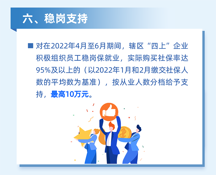 鼓勵企業穩崗留工。對區四類百強企業堅持不裁員或少裁員的(2022年3-5月平均繳交失業保險人數不低于2022年1月的95%),按2022年3月實際繳納失業保險人數給予500元/人的補貼,單家企業最高20萬元。(牽頭單位:區人力資源局)