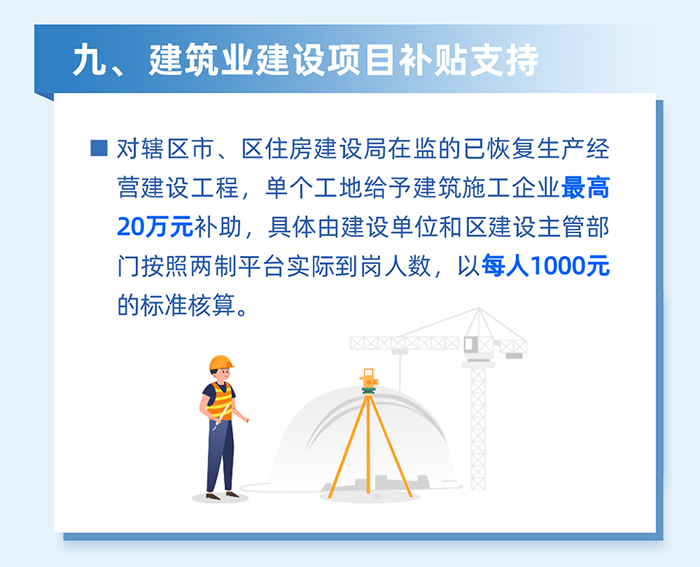 發放在建項目臨時停工補貼。對轄區范圍內區住建、區水務、區城管、區交通以及街道在監的已開工建設工程,在政府依法采取停工等緊急措施期間,按市區政府部門停工通知前一天錄入“兩制”平臺的勞務工人數給予900元/人的補貼給企業,相關補貼由企業通過“兩制”平臺發放至勞務工人賬戶。(牽頭單位:區住房和建設局)