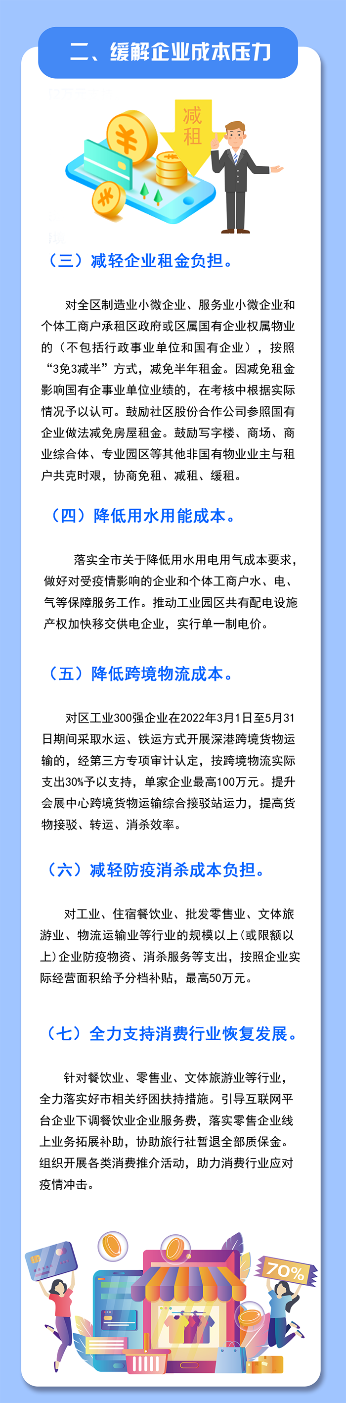 降低企業擔保費用。對2022年3月1日至5月31日期間,申請我區擔保機構信用擔保的企業,按實際支付擔保費的50%予以支持,單家企業最高50萬元。(牽頭單位:區金融工作局)